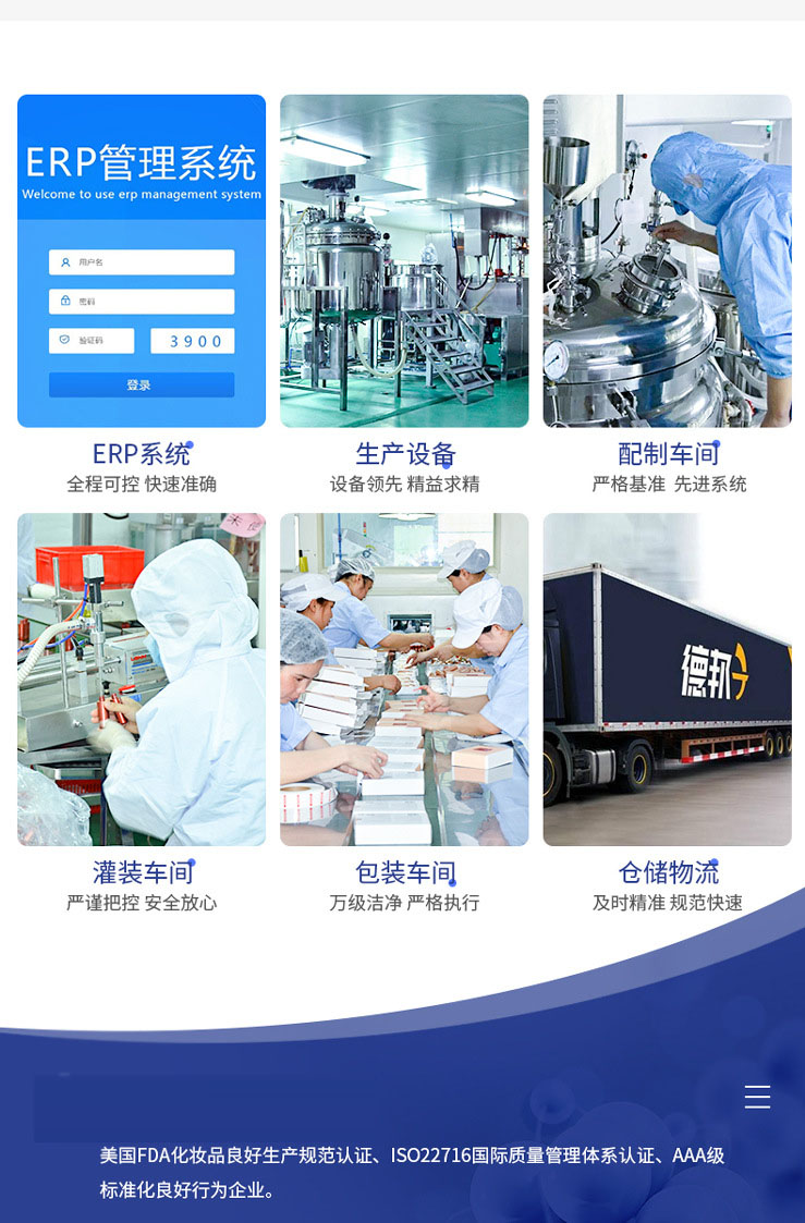 scxkyqwayzas2asz.jpg公司廠區環境優美,廠房面積超10000平方米,生產車間環境完全按照GMPC認證所需要的條件建設,并一次性通過 &ldquo;GMPC&rdquo;認證。公司目前擁有多條現代化的生產線,多臺/套國際、國內先進乳化、自動灌裝、滅菌、檢驗檢測等儀器,具備各類膏霜、洗護、美容化妝產品的生產條件和能力,年生產能力可達到數千萬支,同時工廠不僅能生產各種形態、規格、品種的化妝品,還能提供化妝品所有常規檢驗項目的檢測報務,全方位保證企業的產品在消費者手中的安全使用,讓消費者放心消費。 工廠自投產以來,嚴格按國家各項政策、法規實施經營管理,積極進取,求實創新。嚴格執行質量體系的同時按GMPC要求組織日常全過程生產,使每一支驗收合格的產品,在市場上讓不同地區的消費者滿意,從而讓企業贏得更多消費者的青睞...